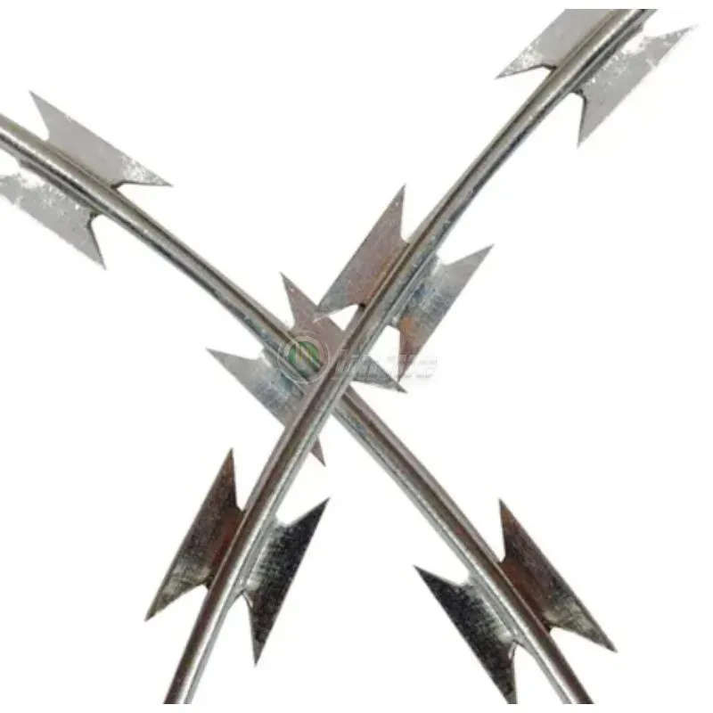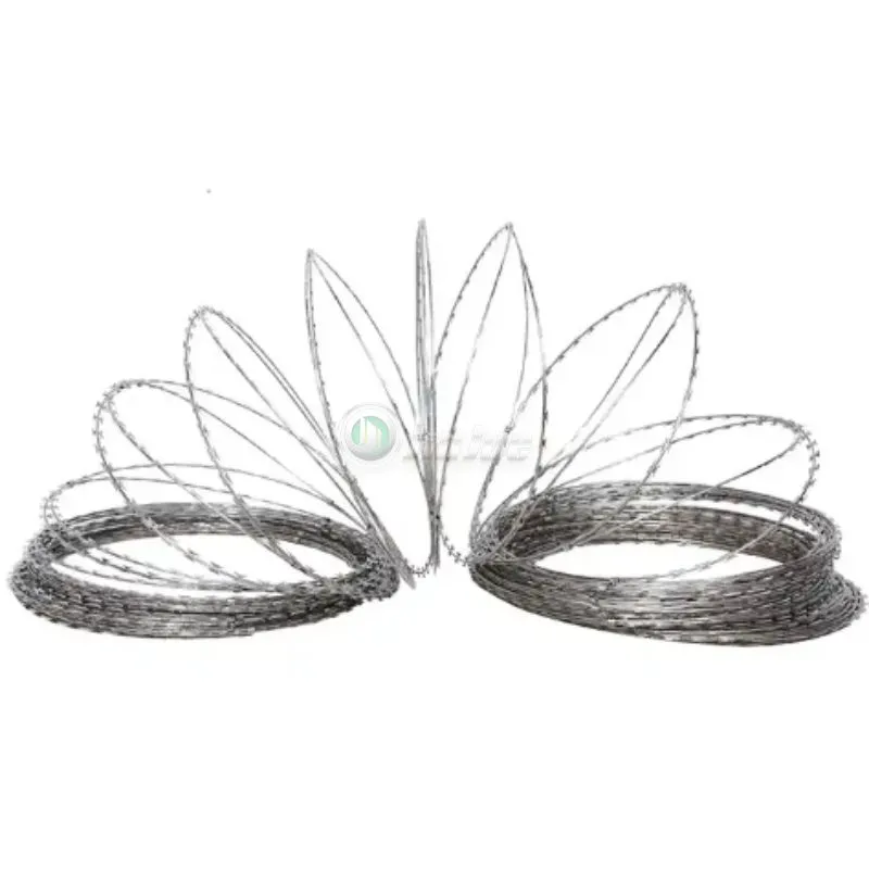O arame farpado de barbear é uma espécie de materiais de cercas de segurança modernos fabricados com lâmina de aço nítido e arame de alta resistência. A fita farpada pode ser instalada para alcançar o resultado de assustador e parar para os invasores agressivos de perímetro, com lâminas de barbear e cortar e cortar montadas no topo da parede, também os designs especiais que dificultam a escalada e tocando extremamente difíceis. O fio e a tira são galvanizados para evitar corrosão.